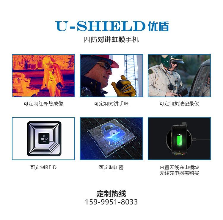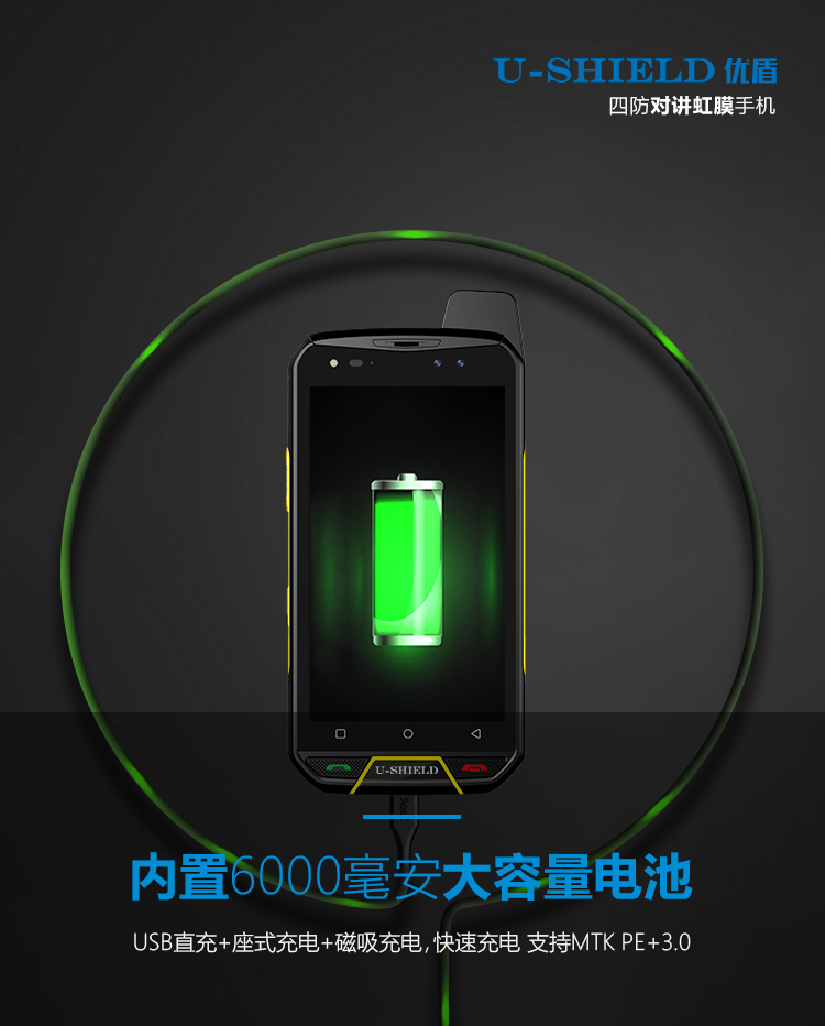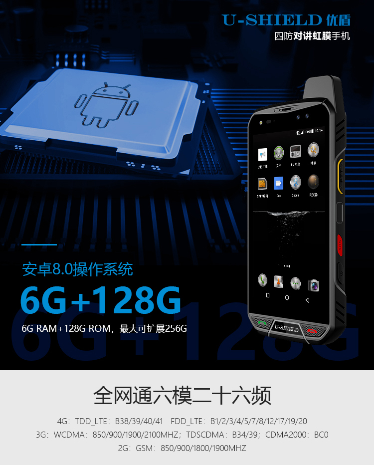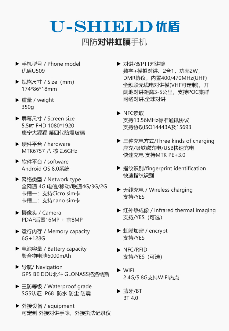 U509四防对讲虹膜手机 数字+模拟对讲 2合1,Android 8.0系统 MTK6757 八核 2.6GHz主频芯片,运行内存6G+128G存储,5.5英寸康宁四代防爆触摸屏,前置800万 后置1600W高清摄像头 匹配LED强光闪光灯、全网通4G 电信/移动/联通4G/3G/2G 聚合物6000mAh大电池 三种充式 (磁吸充电 座充充式(可定制) USB数据线直充) 虹膜识别+指纹识别 IP68三防 防水 防尘 防震 GPS导航+北斗/格洛纳斯全球定位导航系统,NFC