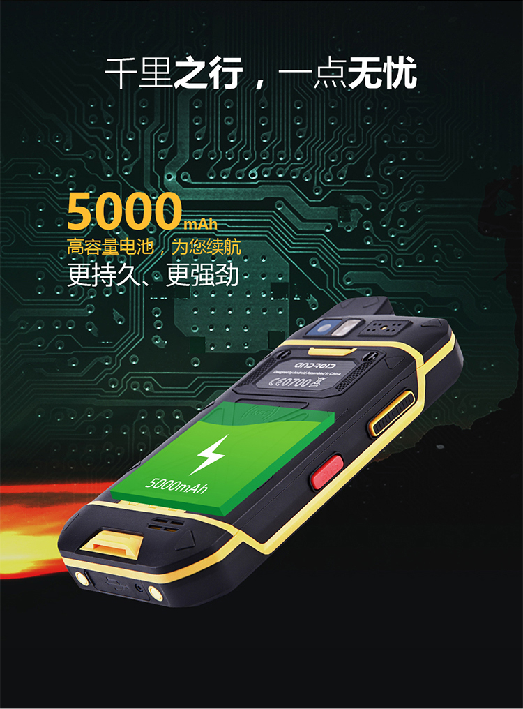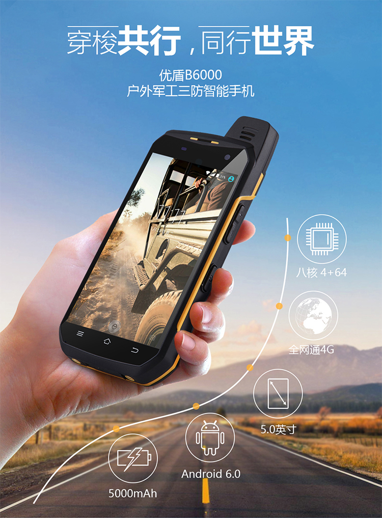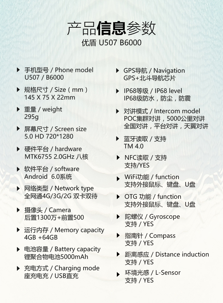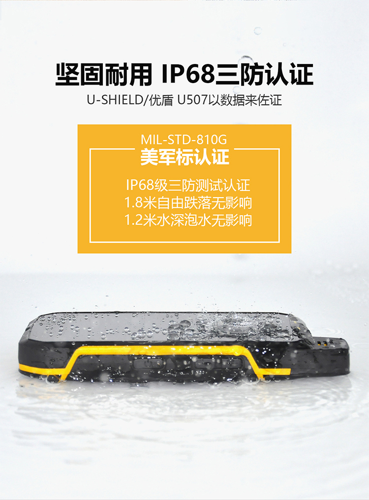 U-SHIELD U507户外三防智能手机采用八核2.0GHz主频芯片,运行内存4G+64G存储,5.0英寸康宁四代触摸屏+OGS高清显示屏,后置1300W高清摄像头,匹配LED强光闪光灯,可作手电筒使用,内置GPS+北斗/格洛纳斯全球定位导航系统,NFC、OTG等等。